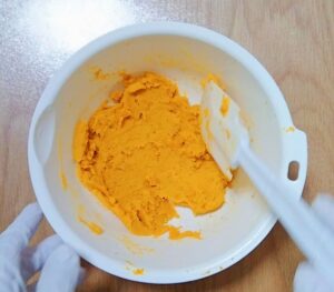 - To the mashed pumpkin, add the sugar, milk (adjust the amount to reach a moldable consistency), and butter. Mix well.