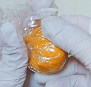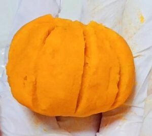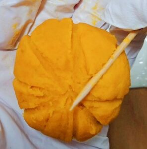 - 💡Tip: You can secure the twisted top with a rubber band for a more stable shape. Once unwrapped, use the dull side of a knife or a skewer to gently press vertical lines onto the surface to resemble a pumpkin.