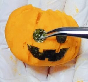 - Gently press the Nori pieces onto the surface of the tea-towel squeeze to create an adorable Jack-o’-Lantern face!
