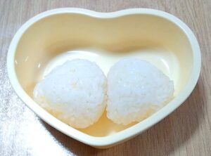 1. Form two rice balls and place them in the bento box so they are nestled together.